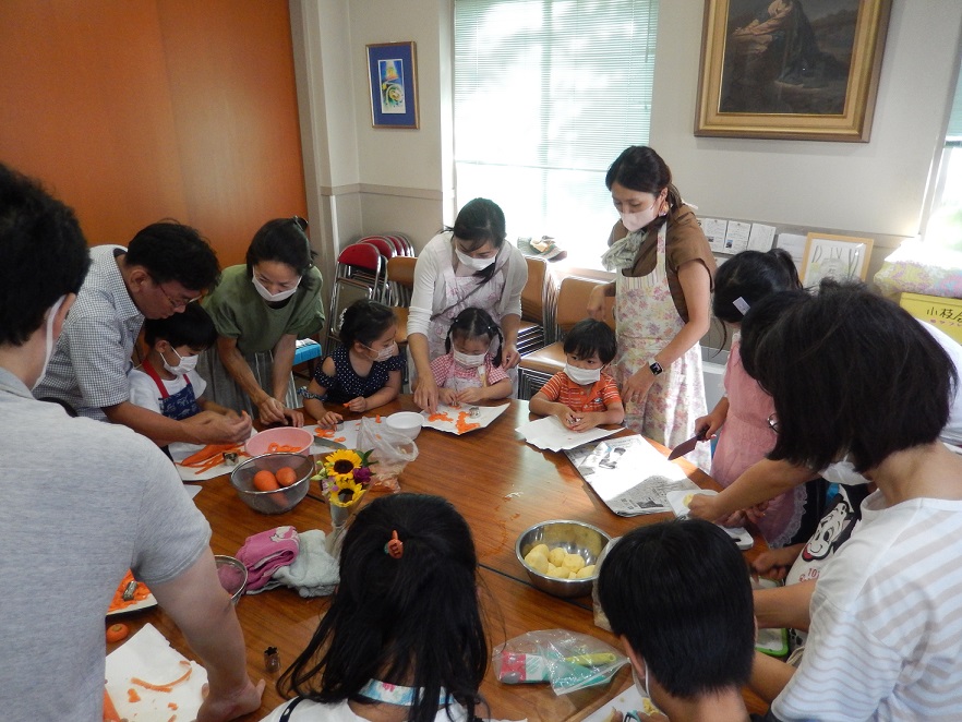 夕涼み会 子ども・大人と一緒にカレー作り。一生懸命野菜を切っています。(2024/8/17)